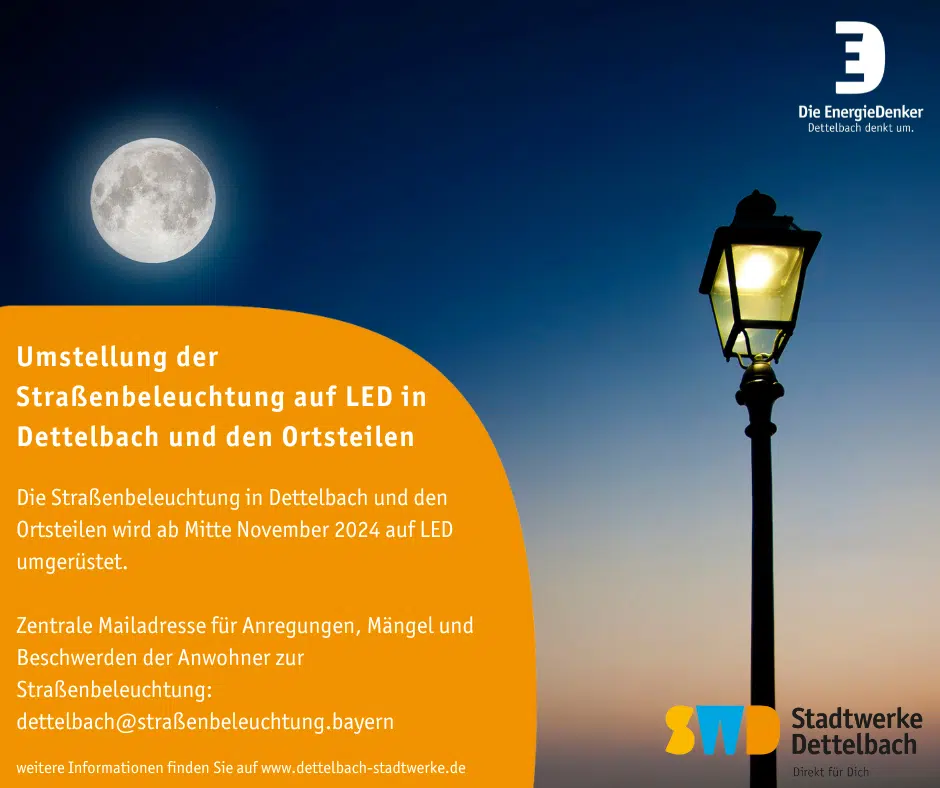 Die Umrüstarbeiten beginnen Mitte November und werden von der WVV Würzburg im Auftrag der Stadtwerke Dettelbach durchgeführt. Im Zuge der Arbeiten werden die Lampen auch ausgerichtet und eingestellt. Dennoch kann es in der Folge vorkommen, dass die Straßenlaternen z.B. zu stark oder zu schwach leuchten. Um die Leuchten optimal auf die Gegebenheiten vor Ort einrichten zu können, sind wir auf die Hilfe und Rückmeldung der Anwohner angewiesen.